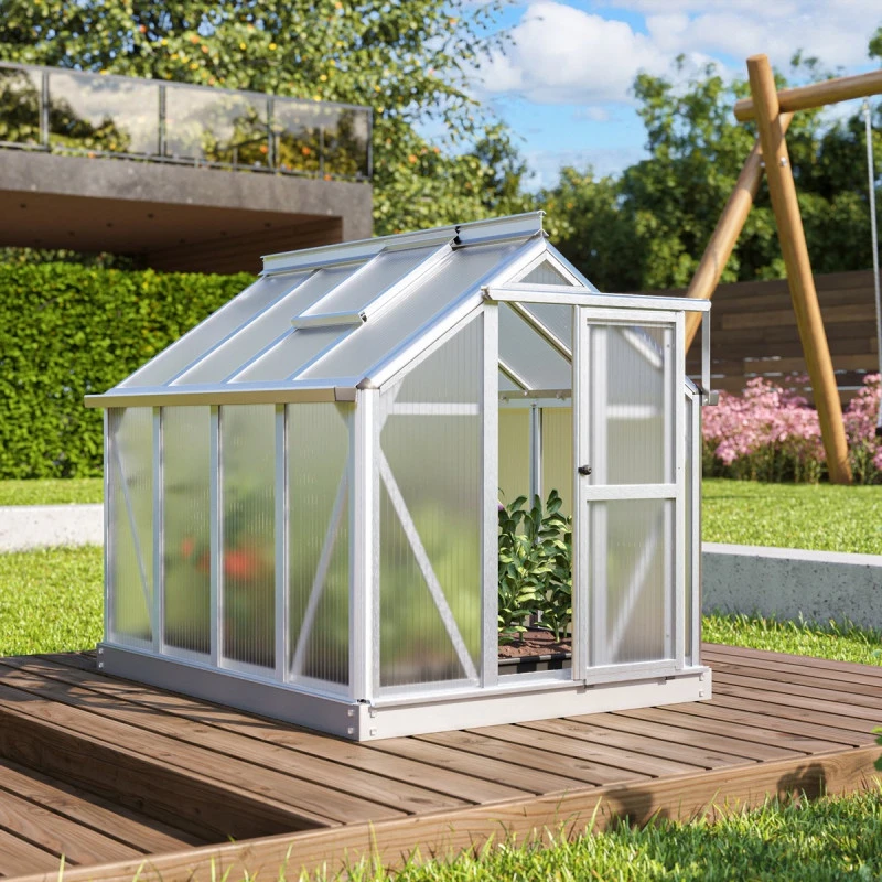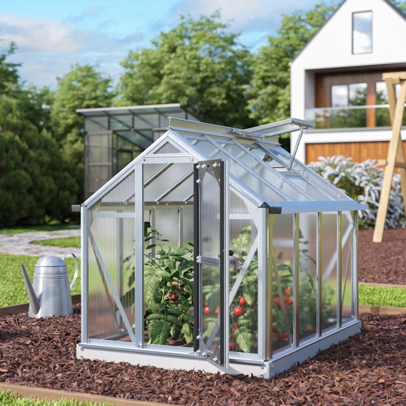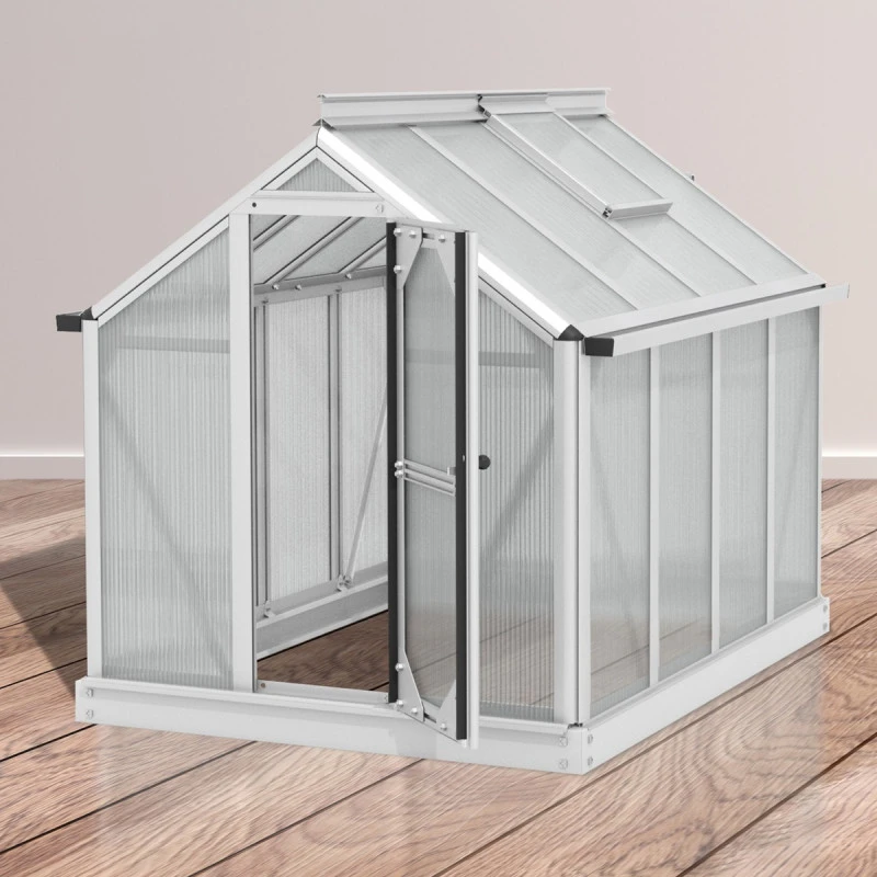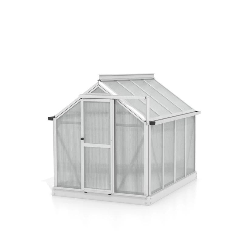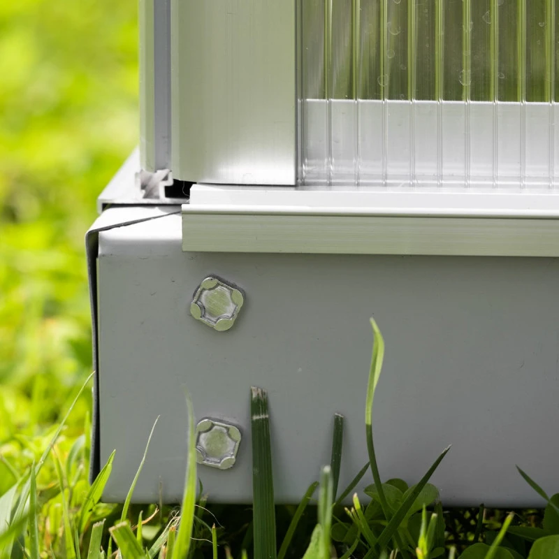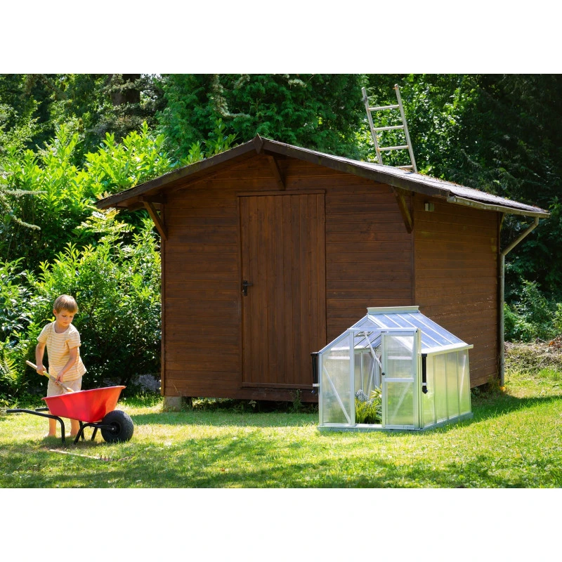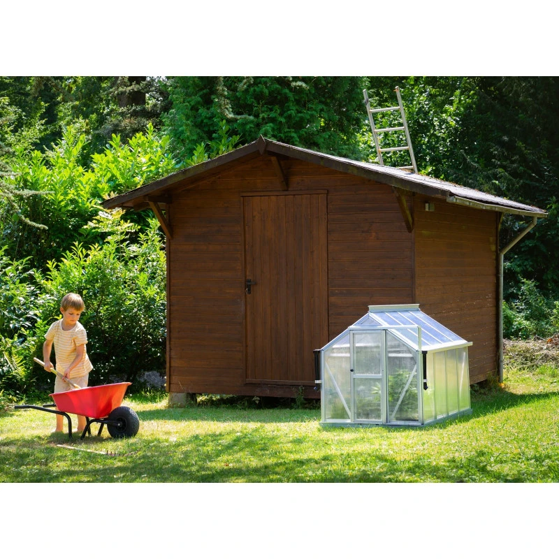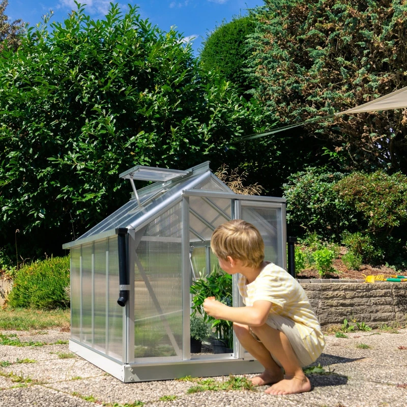 Superbe avec sa petite taille, la serre de jardin Merlin possède tous les atouts d’une grande serre. Les profilés aplatis sont conçus en aluminium anodisé ou peint par poudrage en émeraude ou noir pour une excellente résistance aux intempéries et à la corrosion. Le vitrage est en polycarbonate de 4mm, traité anti-UV, isolant et pratiquement incassable. L’embase en acier d’une hauteur de 6,3cm est également incluse afin de stabiliser la serre Merlin au sol. Une vraie petite merveille !