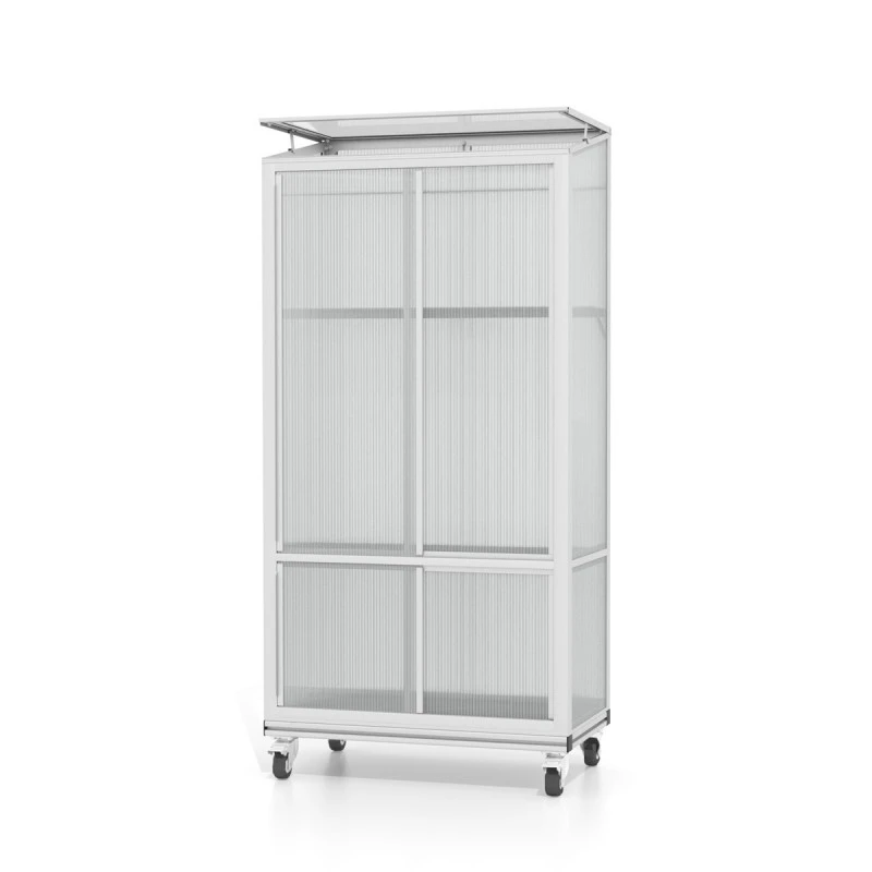 La serre de jardin Polis 350 du fabricant Vitavia est spécialement conçue pour les balcons et les petits espaces. Avec son faible encombrement au sol de 43x81cm et son montage sur roulettes, elle s’installe aisément dans un coin de votre terrasse et peut être déplacée à tout moment, si besoin.