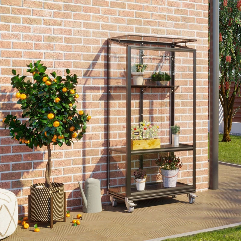 La serre de jardin Polis 350 du fabricant Vitavia est spécialement conçue pour les balcons et les petits espaces. Avec son faible encombrement au sol de 43x81cm et son montage sur roulettes, elle s’installe aisément dans un coin de votre terrasse et peut être déplacée à tout moment, si besoin.