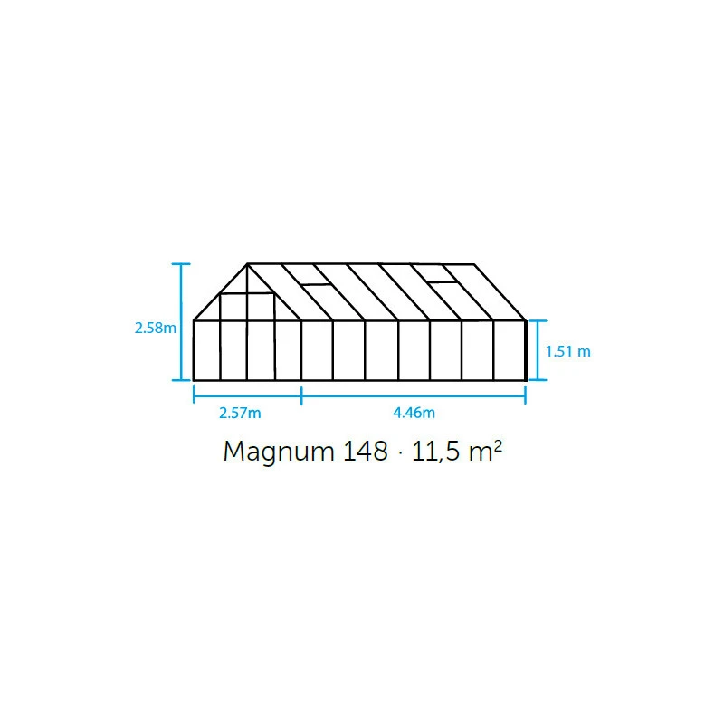 La serre Magnum a la particularité d’avoir des parois et un faîtage plus élevé que les serres de même surface sur le marché. Couplé avec une surface au sol de plus de 11m², le volume intérieur est généreux, vous permettant d’envisager de nombreuses cultures différentes (pleine terre, suspensions, grimpantes…).