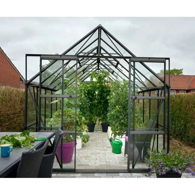 Dans cette version, la serre de jardin Magnum est laquée noire et dispose de panneaux en verre trempé. Le noir est une couleur très tendance qui procure à la fois un look très qualitatif à la serre et en même temps rappelle les serres de l’époques fabriquées avec des armatures en fer noir. L’anthracite a également cette atout de se fondre parfaitement dans un environnement végétalisé et de s’accorder parfaitement avec tout type de murs de maison (brique rouge, pierre…).