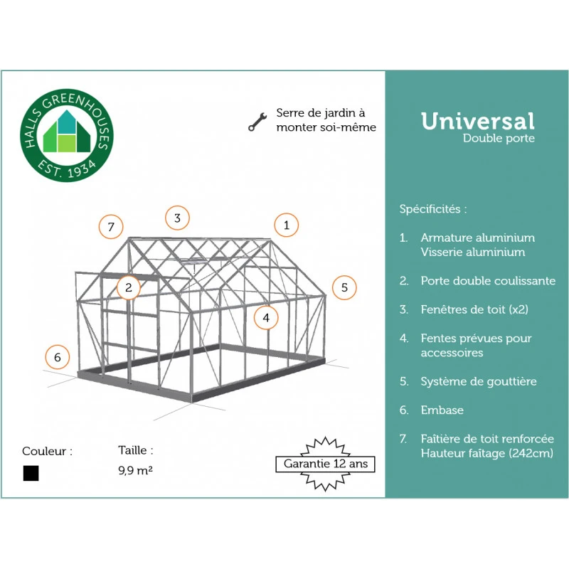 La serre de jardin Universal est un des produits les plus vendus par le fabricant Halls. Sa surface de près de 10m² vous permettra d’envisager de nombreuses possibilités de cultures et d’hivernage.