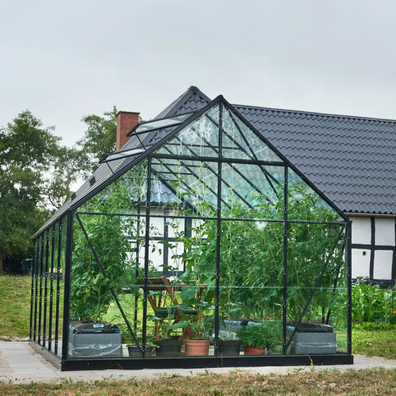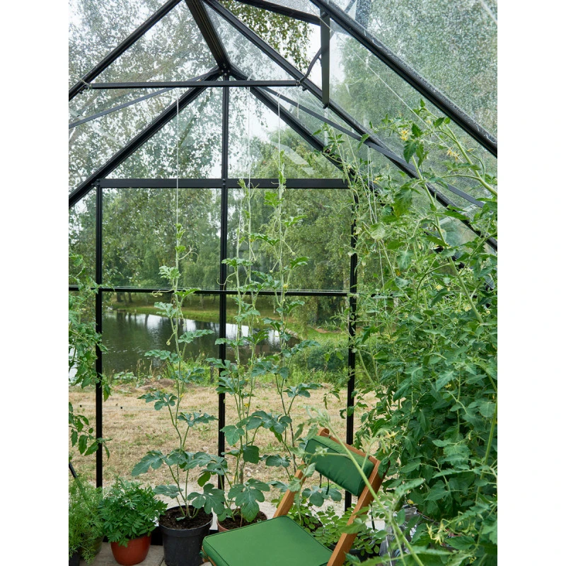 Jamais vue ailleurs! Ma Serre De Jardin vous propose la serre de jardin Universal de Halls avec une armature laquée Noire, qui rappelle les serres d’Antan en fer forgé.