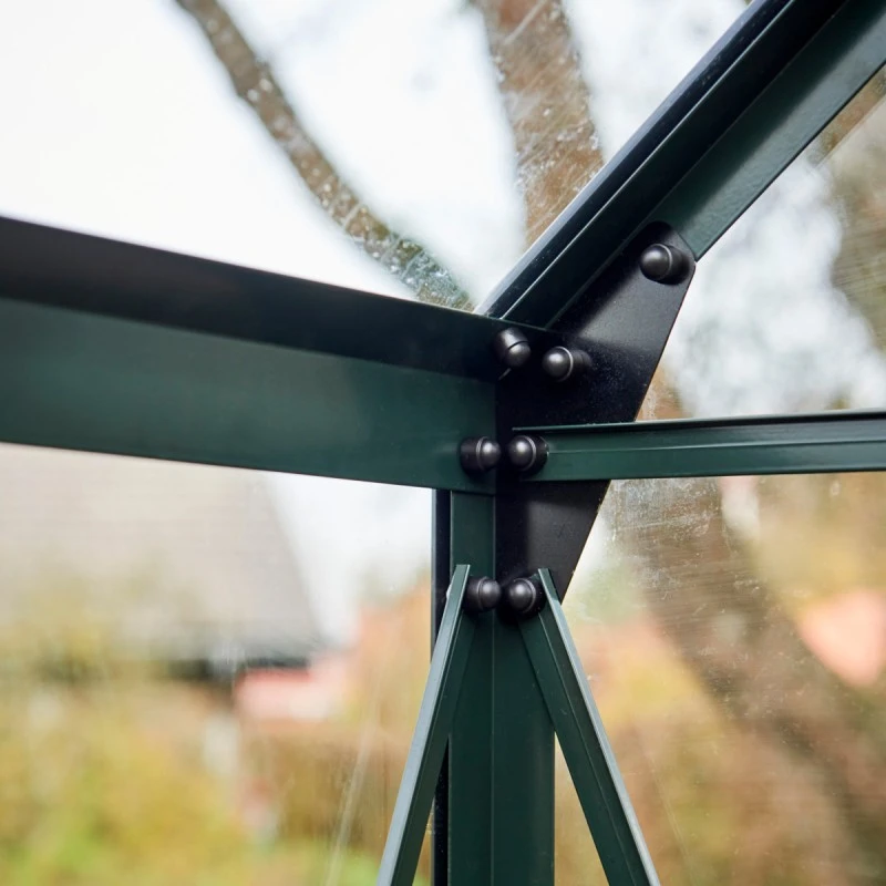 La structure et la visserie sont en aluminium de haute qualité, avec une finition noire laquée durable. La barre faîtière est rehaussée, augmentant l’inclinaison du toit pour gagner en volume et améliorer la résistance au poids de la neige, notamment par l’ajout d’entretoises au niveau de la toiture. La hauteur sous faîtière de 276cm est idéale pour la culture de plantes hautes et le palissage.