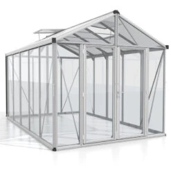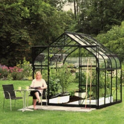 Le vitrage en verre trempé de 4mm est 7 fois plus résistant que le verre horticole, il est peu probable qu’il se brise. Et le cas échéant, il se fragmente en petits morceaux aux bords émoussés et non tranchants. La toiture se compose de petits carreaux assemblés à la manière de tuiles, tandis que les parois latérales sont composées de grands carreaux, pour une luminosité optimale qui bloque le rayonnement UV mais laisse profiter à la serre de la chaleur du rayonnement infrarouge du soleil.