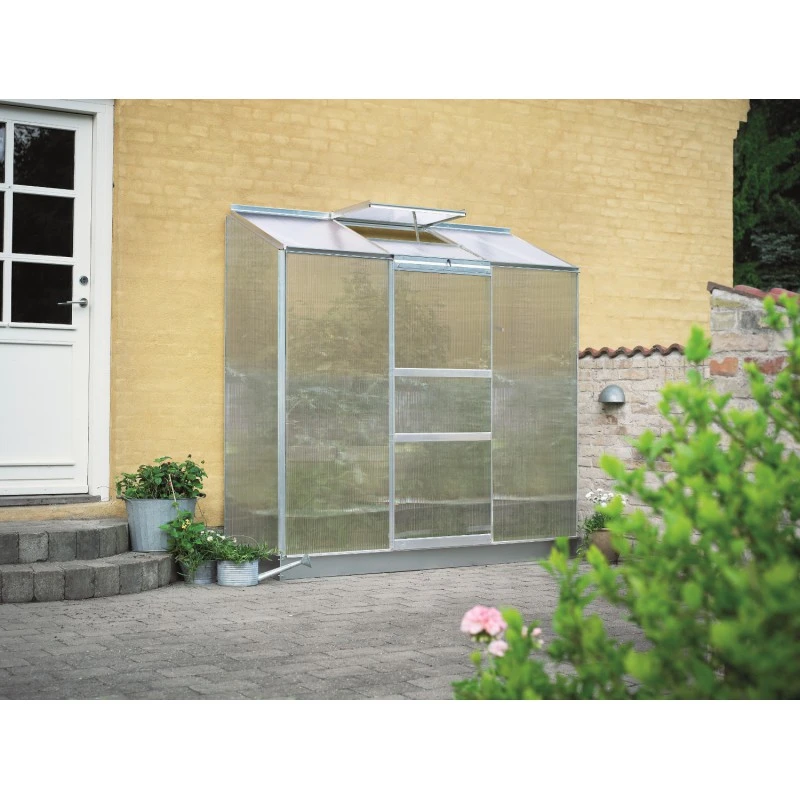La serre de jardin adossée Altan 3 dispose d’une porte coulissante en façade et d’une fenêtre de toit.