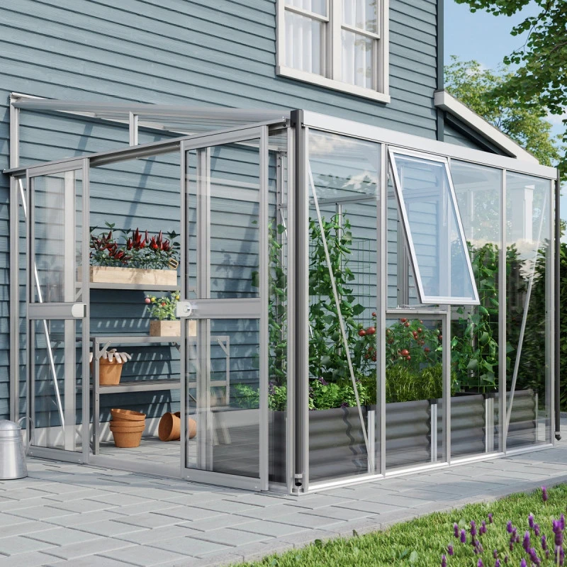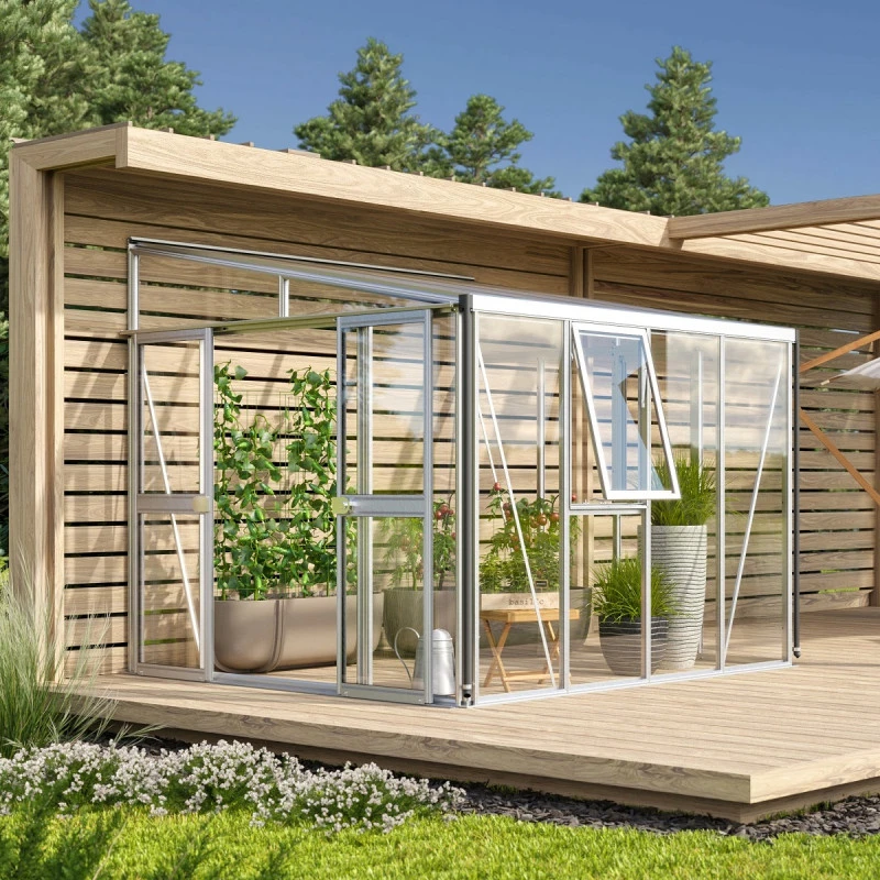 La conception robuste de la serre adossée Athena repose sur des profilés en aluminium à double cadre qui assurent un montage solide aux vitres et résistent parfaitement à la corrosion et aux intempéries. Le profilé de sol inclus facilite l’ancrage et la préparation des fondations tandis que le kit d’extension, en option, vous permet de renforcer les profilés du toit et d’obtenir une capacité de charge optimale.
