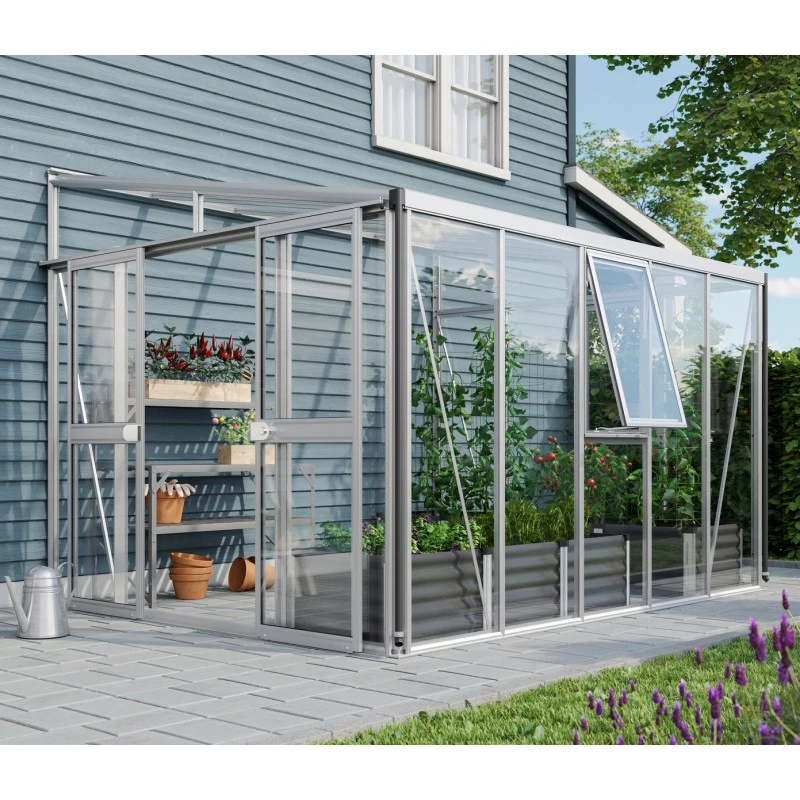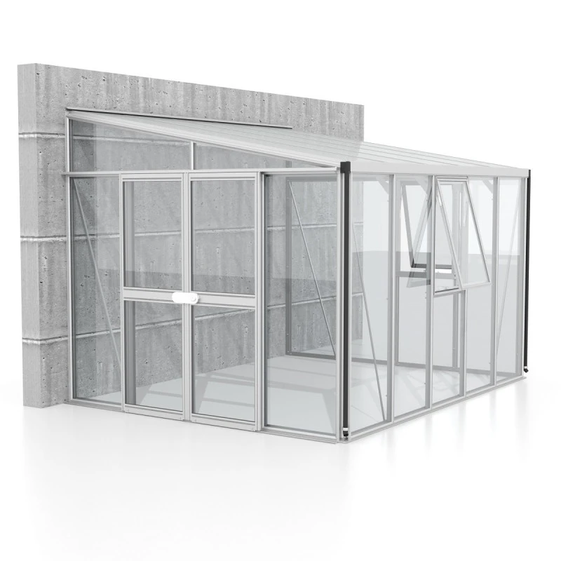 La conception robuste de la serre adossée Athena repose sur des profilés en aluminium à double cadre qui assurent un montage solide aux vitres et résistent parfaitement à la corrosion et aux intempéries. Le profilé de sol inclus facilite l’ancrage et la préparation des fondations tandis que le kit d’extension, en option, vous permet de renforcer les profilés du toit et d’obtenir une capacité de charge optimale.