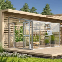 La serre adossée en alu et vitrage combiné Athena est facile d’accès. Elle possède une double porte coulissante avec montage au choix – en façade ou sur les côtés. Le kit de porte est également disponible en option, si vous souhaitez ajouter une porte supplémentaire. Elle se ferme à clé pour sécuriser votre contenu.
