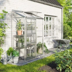 La serre de jardin Ida 900 du fabricant Vitavia est le choix parfait pour les terrasses et les balcons. Compacte au sol avec ses dimensions de 69x131cm, elle est dotée d’un toit en appentis pour se coller au mur de votre habitation. La simple porte coulissante permet aussi de gagner de la place et d’intégrer la serre de jardin Ida 900 dans les espaces limités. La culture des herbes aromatiques à portée de main est totalement possible !