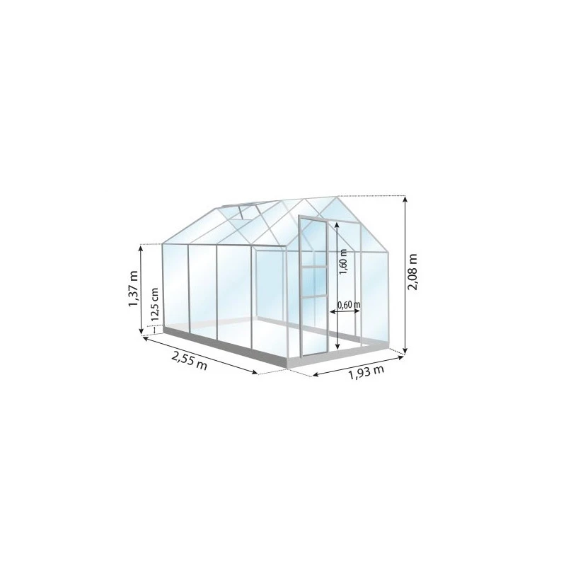 Une lucarne en toiture assure une bonne circulation de l’air et permet l’évacuation de la chaleur excessive. L’accès se fait par une porte coulissante large de 60cm, qui ne risque donc pas de battre brutalement en cas de coup de vent. Les dimensions de la serre sont de 193cm pour la façade sur 255cm de profondeur, avec une hauteur faîtière de 208cm. Garantie de 10 ans sur la structure et de 5 ans sur les joints d’étanchéité.