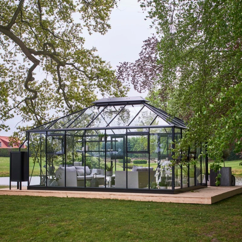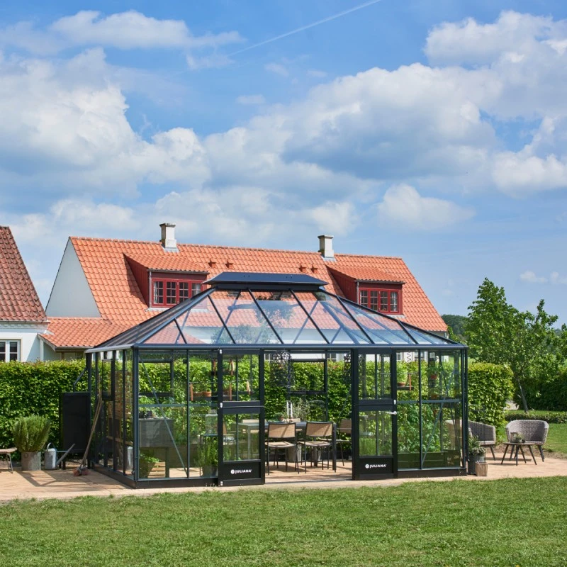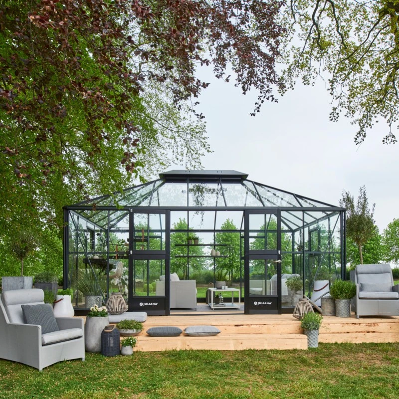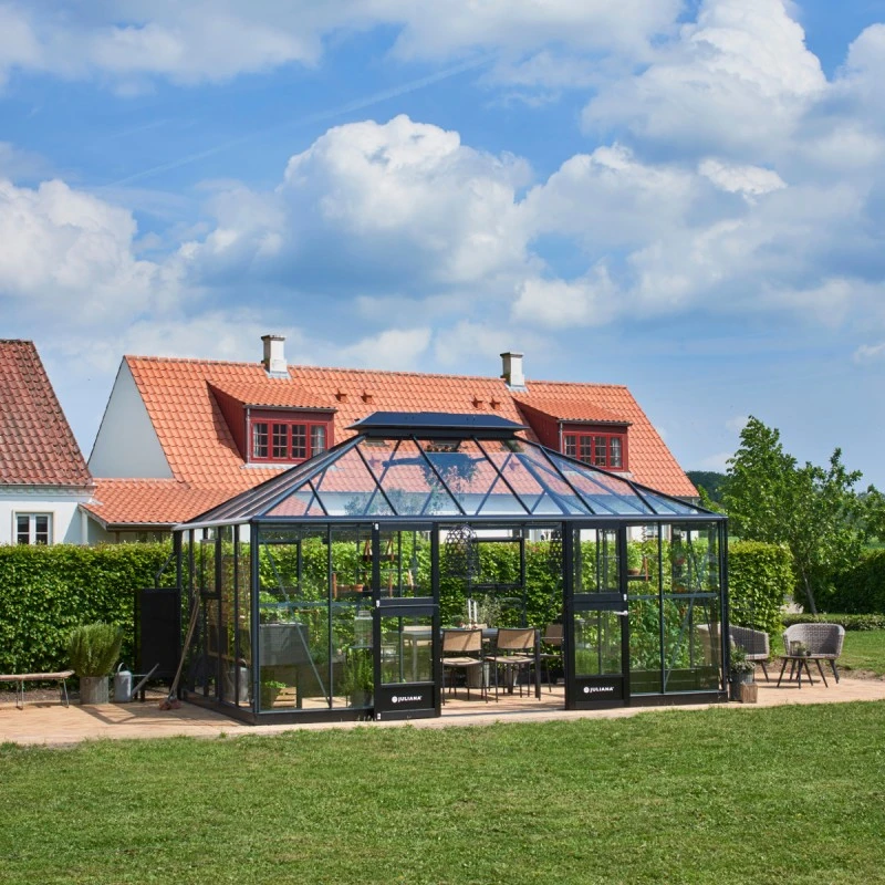 Magnifique ! Le fabricant Danois Juliana, spécialiste dans la fabrication de serres de jardin de qualité propose cette nouveauté à mi chemin entre la serre de culture et le jardin d’hiver. Elle peut d’ailleurs être utilisée simultanément pour ces 2 finalités, en réservant une partie pour un coin détente et l’autre partie pour les cultures et l’hivernage.