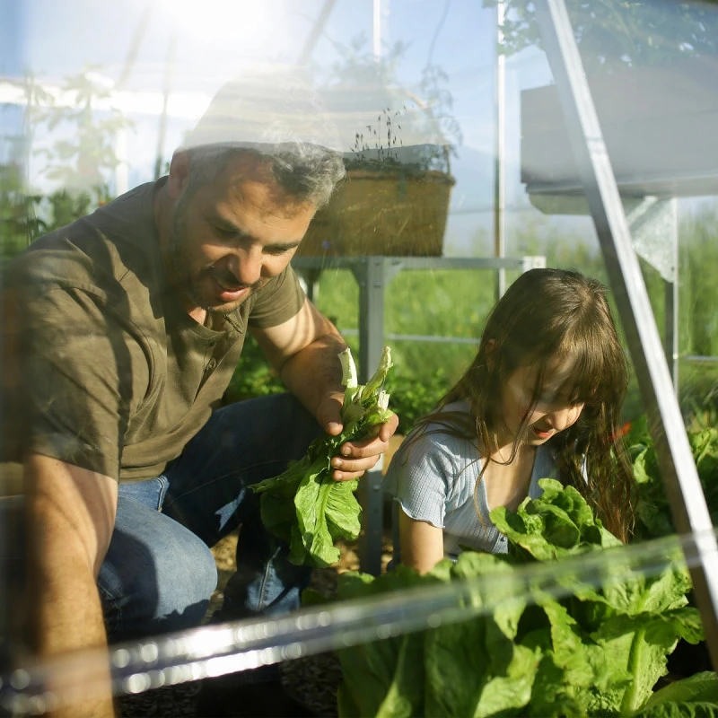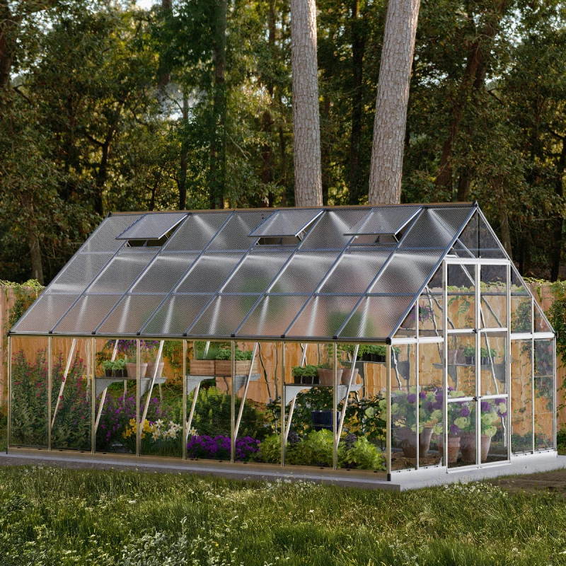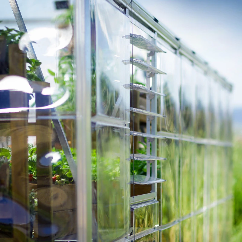 La gamme de serres Balance extra large sont munies de deux types de vitrage. Le vitrage des parois est en polycarbonate cristallin épais de 0,7mm qui assure plus de 90% de transmission de la lumière. Les panneaux de la toiture sont en polycarbonate de 4mm d’épaisseur à double paroi, qui laissent passer 82% de la lumière pour un léger effet d’ombrage. Cette combinaison de matériaux offre une exposition lumineuse optimale et équilibrée.
