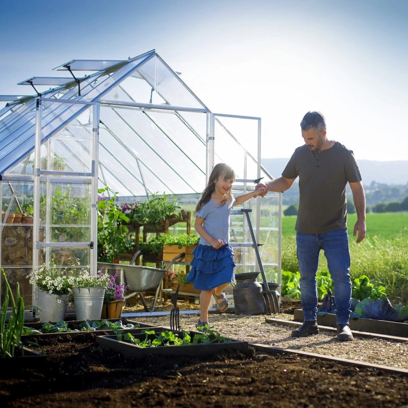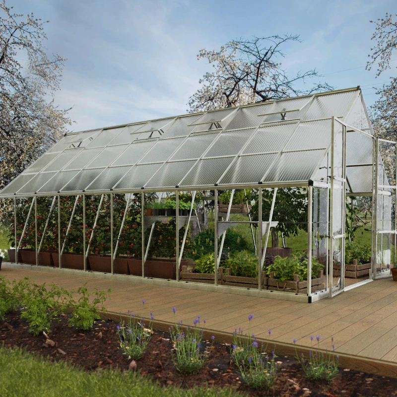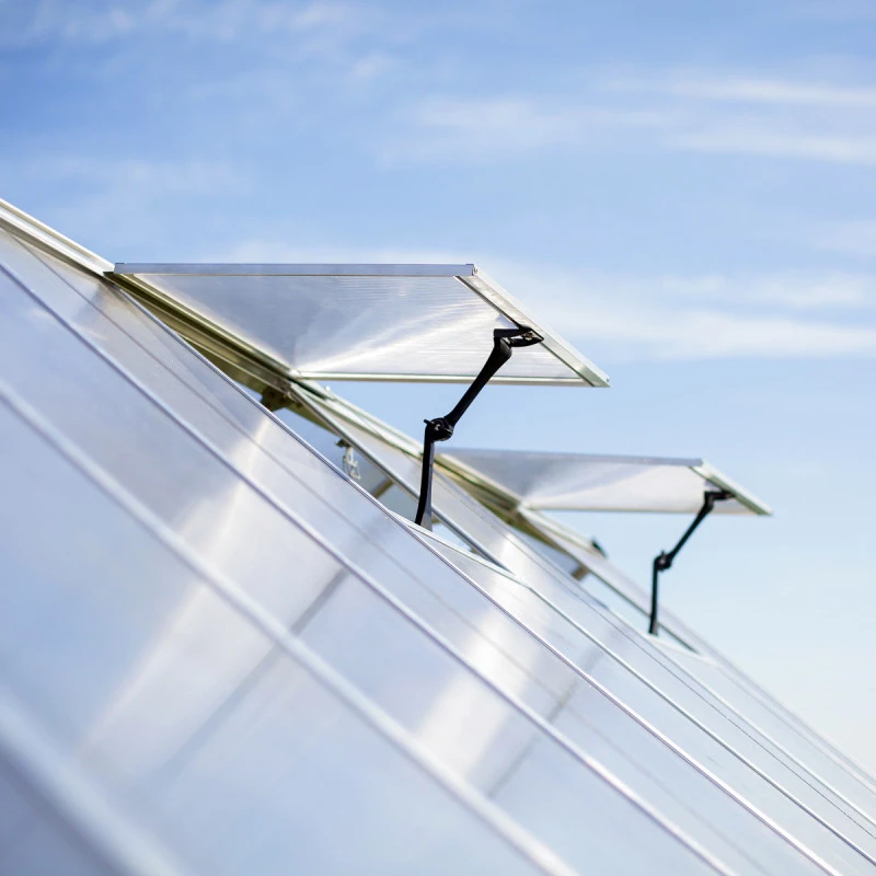 La gamme de serres Balance extra large sont munies de deux types de vitrage. Le vitrage des parois est en polycarbonate cristallin épais de 0,7mm qui assure plus de 90% de transmission de la lumière. Les panneaux de la toiture sont en polycarbonate de 4mm d’épaisseur à double paroi, qui laissent passer 82% de la lumière pour un léger effet d’ombrage. Cette combinaison de matériaux offre une exposition lumineuse optimale et équilibrée.