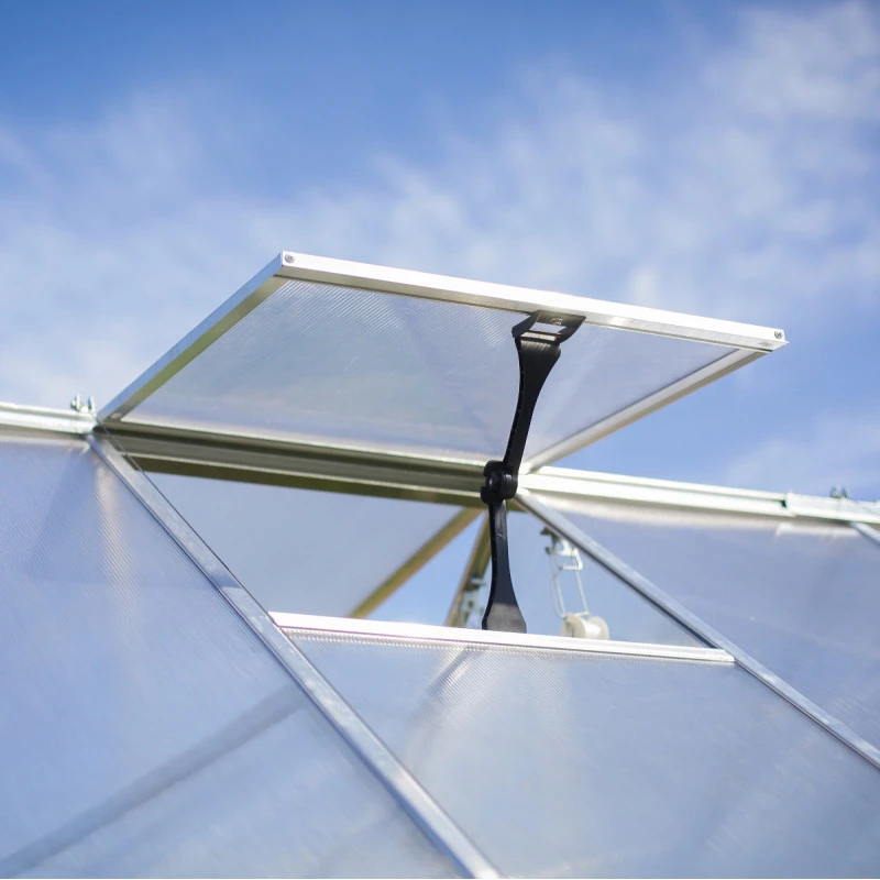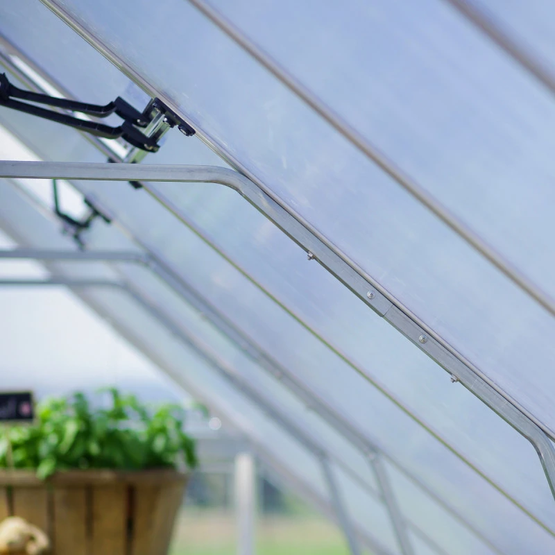 La gamme de serres Balance extra large sont munies de deux types de vitrage. Le vitrage des parois est en polycarbonate cristallin épais de 0,7mm qui assure plus de 90% de transmission de la lumière. Les panneaux de la toiture sont en polycarbonate de 4mm d’épaisseur à double paroi, qui laissent passer 82% de la lumière pour un léger effet d’ombrage. Cette combinaison de matériaux offre une exposition lumineuse optimale et équilibrée.