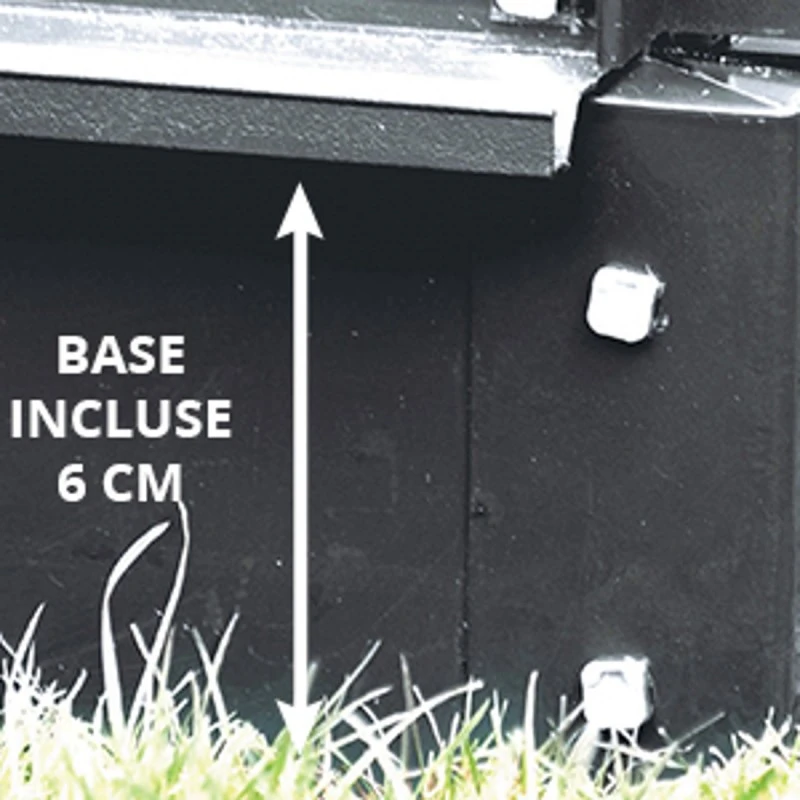 Grâce à l’embase fournie en acier galvanisé laqué de la même couleur que la structure, vous pourrez installer votre serre à même le sol, sur une pelouse, à condition qu’il soit bien nivelé. L’embase peut également être fixée sur une dalle de béton, d’une épaisseur de 15cm minimum, ou scellée par les pattes de fixation dans des plots en béton. L’embase rigidifie la structure et aide à une construction d’équerre, ainsi que les tirants métalliques reliant les éléments verticaux de la structure.