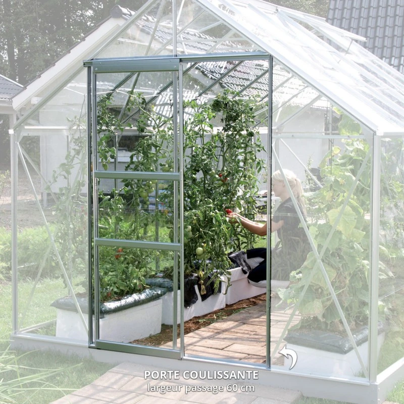 Le vitrage de la serre est du verre de sécurité de 3mm d’épaisseur, ayant subi un traitement thermique de trempage, et lui assurant une résistance 7 fois supérieure au verre horticole classique. Il ne craint ni les rayures, ni de se décolorer et est facile à entretenir. Dans le cas peu probable d’un bris, il se fragmente en petits morceaux non tranchants, ajoutant à votre sérénité. La qualité des matériaux utilisés, comme la visserie en acier inoxydable, font de cette serre une construction durable, dont la structure est garantie 10 ans.