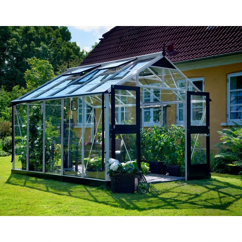 Les profilés de la structure ont une finition en aluminium, tandis que le montant de la porte ou le fronton en métal qui surplombe la façade sont peints en noir. Tous les matériaux utilisés sont résistants à la corrosion. En plus de son aspect esthétique plaisant, comme les fleurons en plastique moulé reliant la barre faîtière, cette serre est fabriquée pour durer de longues années. Des renforts métalliques assurent une excellente stabilité au niveau des angles, et des joints en caoutchouc garantissent une étanchéité entre le vitrage et les profilés.