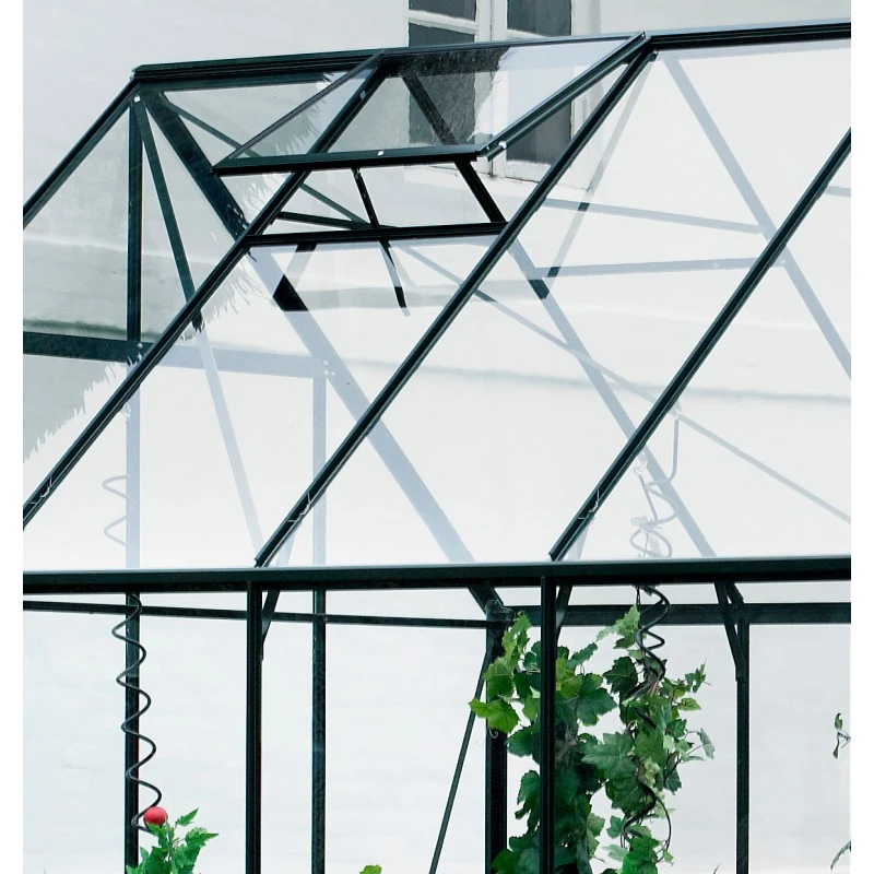 4 lucarnes de toit sont fournies pour pouvoir aérer l’intérieur de la serre. Elles peuvent être automatisées grâce à des compas automatiques disponibles en option.