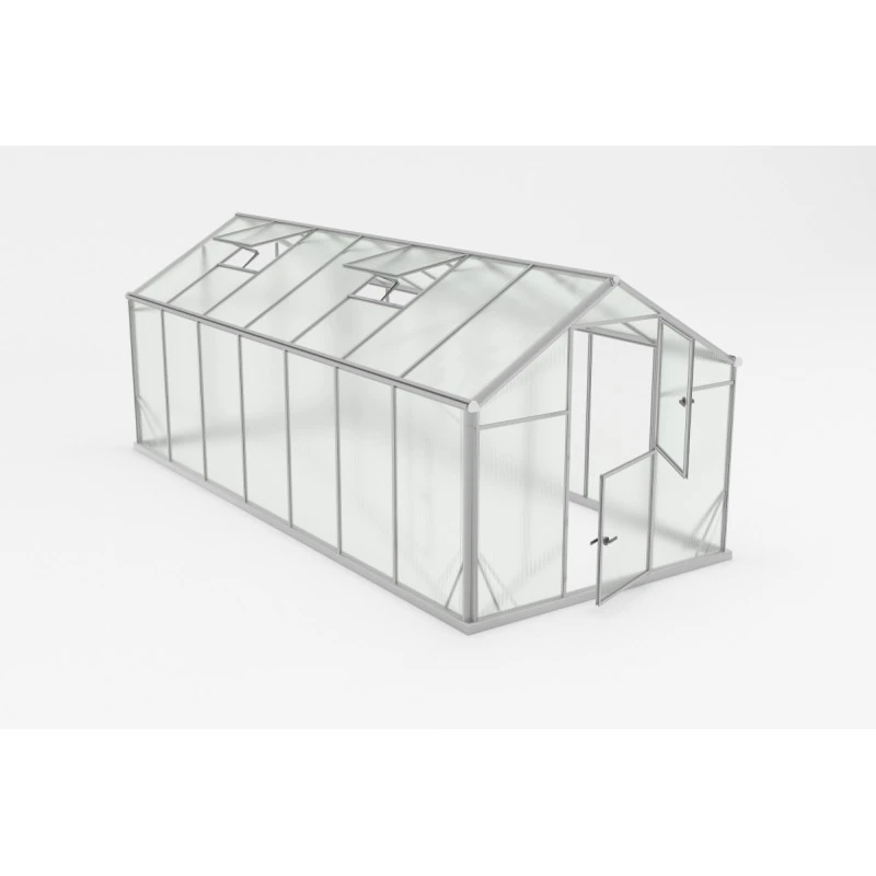 La serre jouit d’une excellente stabilité structurelle, avec des profilés en aluminium très résistants et des renforts d’angles métalliques. Deux lucarnes de ventilation à ouverture automatique assurent une circulation optimale de l’air à l’intérieur de la serre, ainsi qu’une porte de type étable à deux panneaux dont l’ouverture se fait de façon indépendante. La porte est munie d’une poignée et de supports pour faciliter l’ouverture, un seuil bas permet le passage aisé d’une brouette ou de conteneurs à déchets organiques.