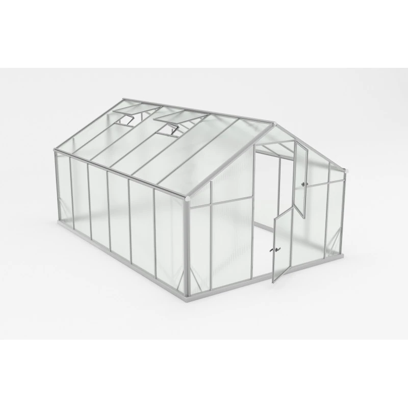 Les 2 lucarnes de ventilation à ouverture automatique et la fenêtre arrière sont aussi très utiles pour une régulation optimale de la température et du taux d’humidité dans la serre. Les éléments de la structure sont en profilés d’aluminium pour un montage simple et rapide, et les parois sont en panneaux de polycarbonate de 6mm, qui diffusent la lumière uniformément et procurent une température constante à l’intérieur de la serre grâce à leurs qualités isolantes. Le polycarbonate, fabriqué en Autriche, est pratiquement incassable, ne se griffe pas et résiste aux rayonnement UV. Cette serre est livrée avec son embase, qui facilite le montage et renforce la stabilité structurelle de la construction. Un ensemble de gouttières permet de recueillir l’eau de pluie, pour un arrosage écologique et une économie d’eau.