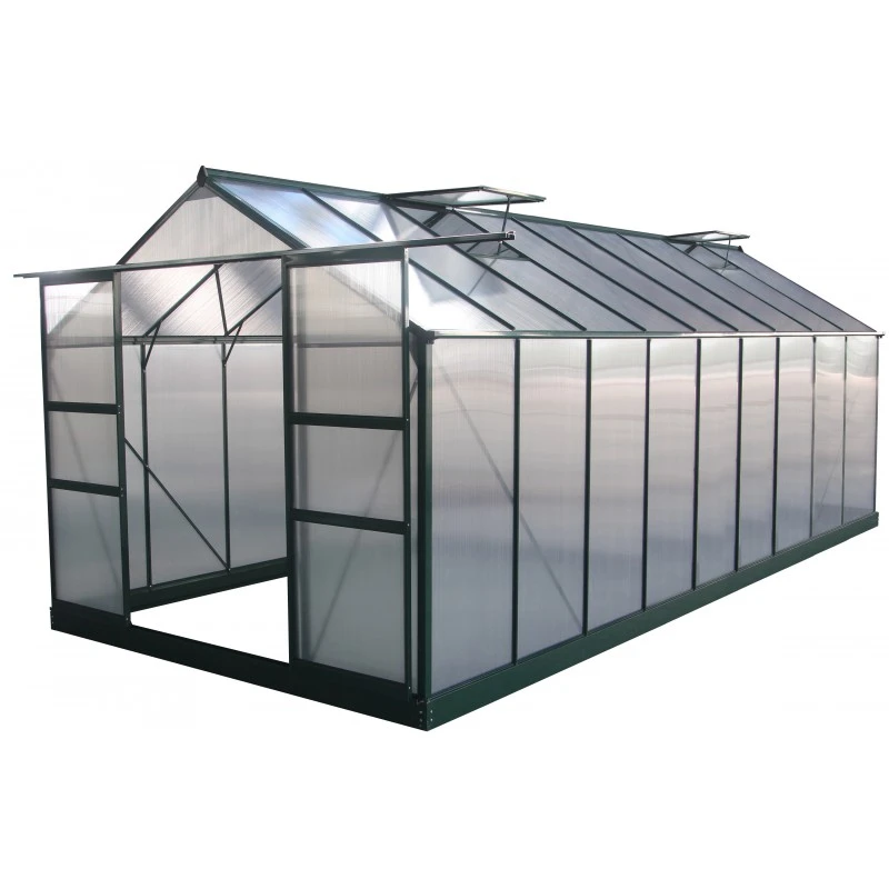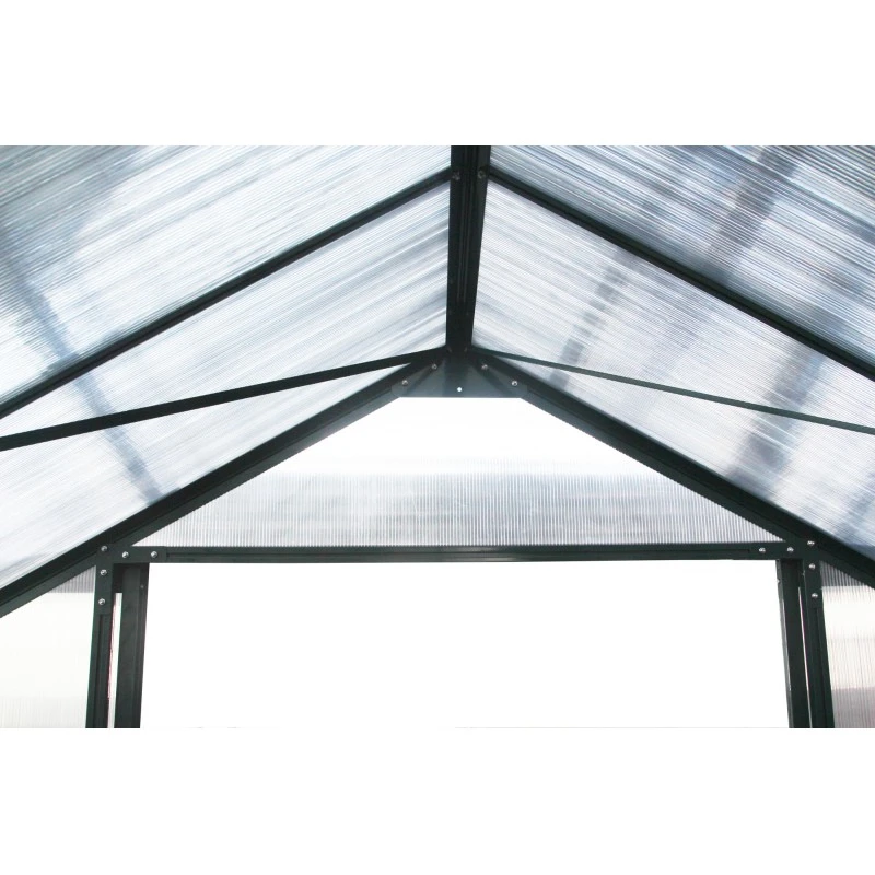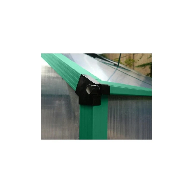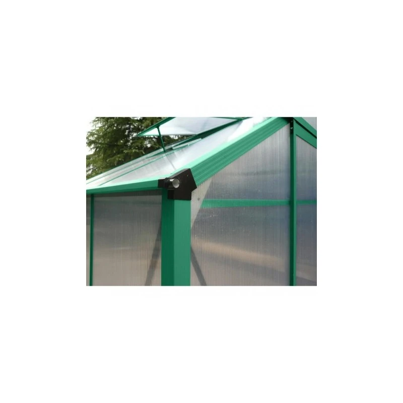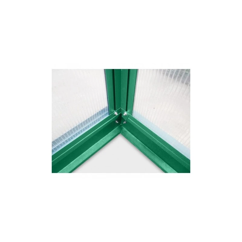 Les profilés de cette serre de jardin sont en aluminium de 1,2 à 1,5mm d’épaisseur, laqué vert, ce qui lui apporte son côté décoratif très appréciable. Ils sont conçus pour recevoir et fixer simplement les panneaux de polycarbonate. A la différence des serres de jardin d’un niveau entrée de gamme sur le marché, cette serre n’utilise pas de clips. Les panneaux se glissent facilement dans l’armature. Résistance améliorée, esthétisme préservé. De plus, la visserie est en inox, donc anti-corrosion, alors que les autres serres sur le marché proposent une visserie en acier.