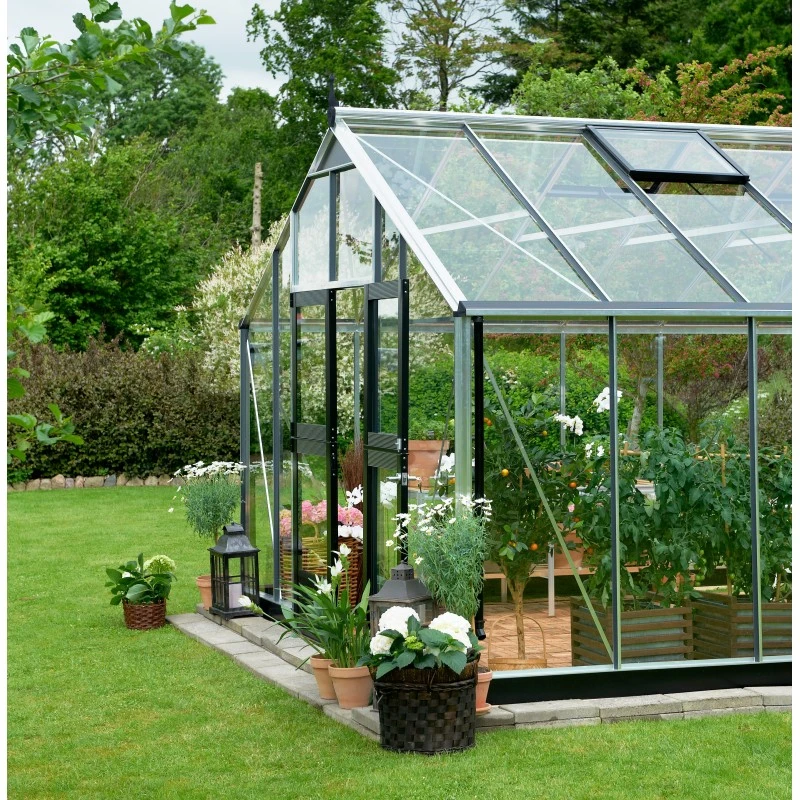 La serre de jardin Gartner a un look majestueux conféré par ses hauteurs imposantes mais également par les fleurons noirs en bouts de faitage qui élancent la serre vers le ciel et la plaque métallique noire portant la marque reconnue Juliana.