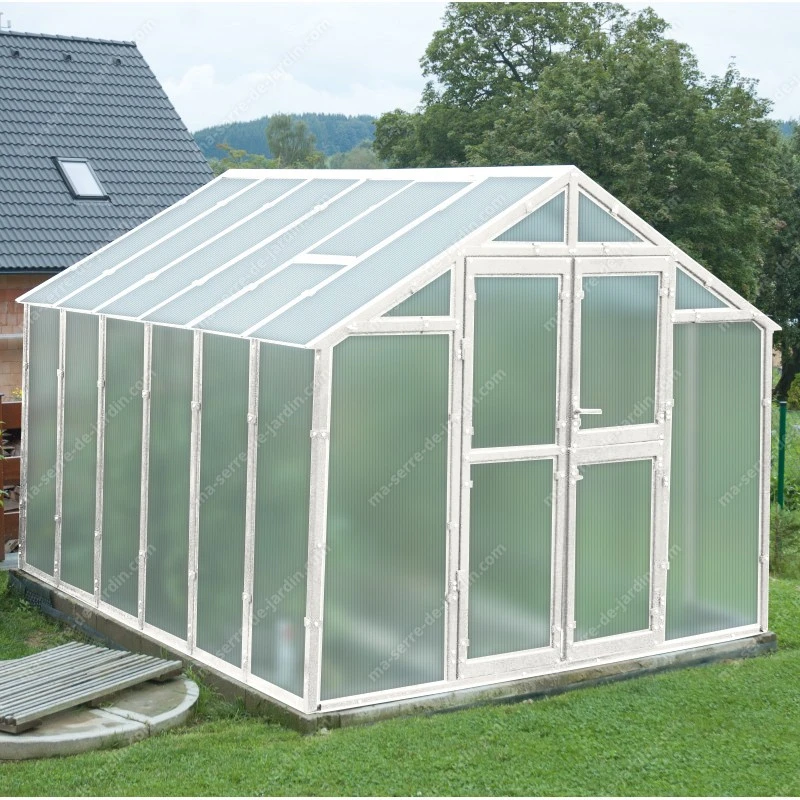 Les parois obliques, qui sont une source de lumière importante, et la toiture de votre serre de jardin 7,62m² sont réalisées en panneaux de polycarbonate translucide. Son épaisseur de 8mm, supérieure à celle des produits semblables sur le marché protégera parfaitement votre serre contre les chocs éventuels. Alternative au verre traditionnel, le polycarbonate est un matériau plus isolant et plus léger. Le montage simplifié s’effectue avec des pattes de fixation solides vissées sur les profilés qui plaquent les panneaux en polycarbonate sur l’armature en acier galvanisé. C’est un système innovant qui renforcera la stabilité de votre serre de jardin Primus face aux vents violents. Le revêtement de zinc sur la structure diminuera les risques de rouille et garantira votre serre Limes 10 ans anti-corrosion.