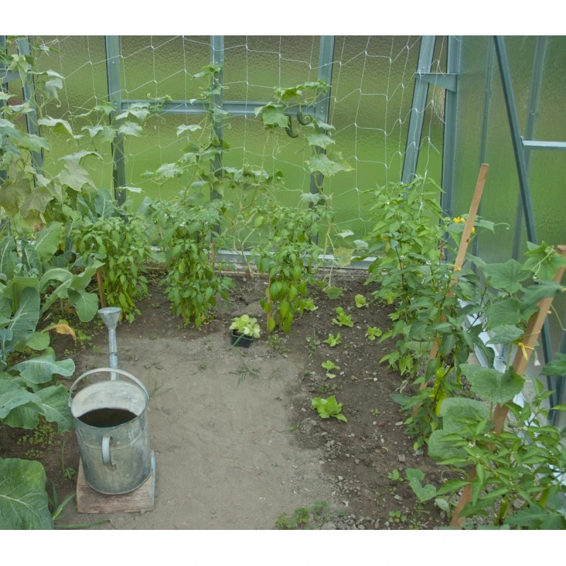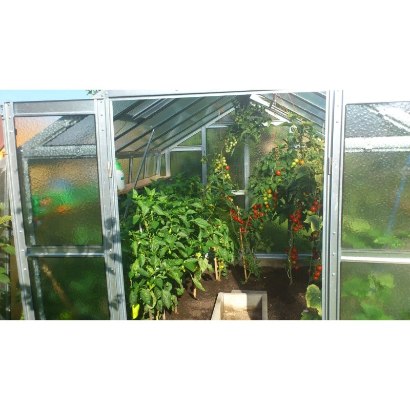 Le verre cathédrale, épais de 4mm, utilisé pour les panneaux de votre serre de jardin Variant diffusera la lumière naturelle d’une façon uniforme en protégeant ainsi vos cultures de l’agression directe des rayons du soleil et des surchauffes nuisibles pour vos plantes. Avec le verre cathédrale sécurit, vous n’aurez pas besoin d’installer de rideaux ou de peindre vos parois pour la protection de vos plantes. Des baguettes en caoutchouc sont livrées en standard pour la pose des verres de toit. Pour un rangement optimal, vous pourrez disposer des étagères spéciales disponibles en option. Nous vous proposons également d’équiper votre serre d’une 2ème double porte pour des accès facilités et favoriser une ventilation rapide.