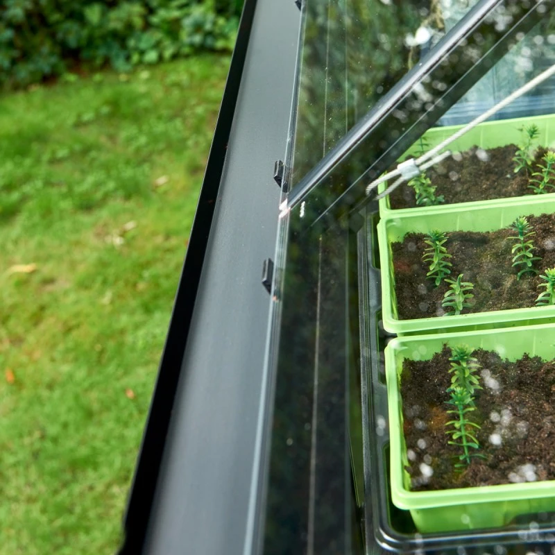 La structure de cette serre est en profilés d’aluminium dont la section en croix assure une grande robustesse structurelle et une légèreté des matériaux. Laqués en noirs, ces profilés résisteront durablement au passage du temps et des éléments. Le vitrage est constitué de larges panneaux en verre trempé de 3mm, d’une grande résistance et conçus pour qu’en cas de bris, ils se fragmentent en petits morceaux aux bords émoussés et inoffensifs.