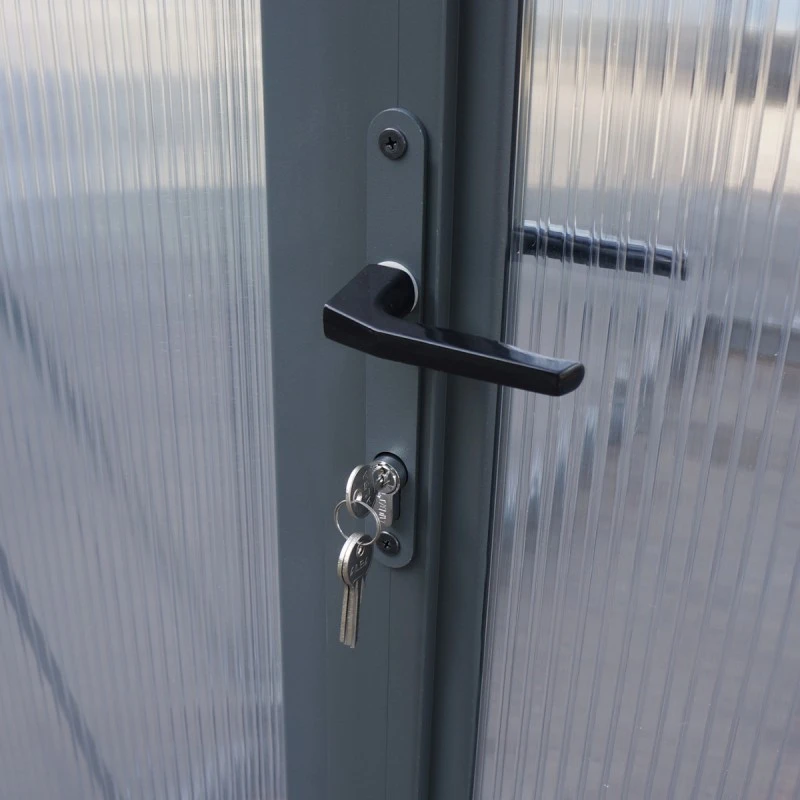 La serre Glory™ de 4,77m² est une serre haut de gamme livrée avec une belle panoplie d’accessoires. La large porte d’entrée avec poignée et serrure est équipée d’un bas de porte brosse pour empêcher à la poussière et aux courants d’air d’entrer, elle peut se monter avec l’ouverture à droite ou à gauche, et dispose d’un seuil bas pour faciliter le passage d’objets roulants (brouette, tondeuse, conteneurs à déchets).