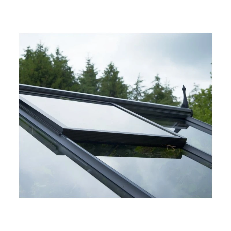 La couleur anthracite de l’armature, autrefois réservée aux serres de plus grandes dimensions, ajoute un charme incomparable à cette serre Compact de Juliana.