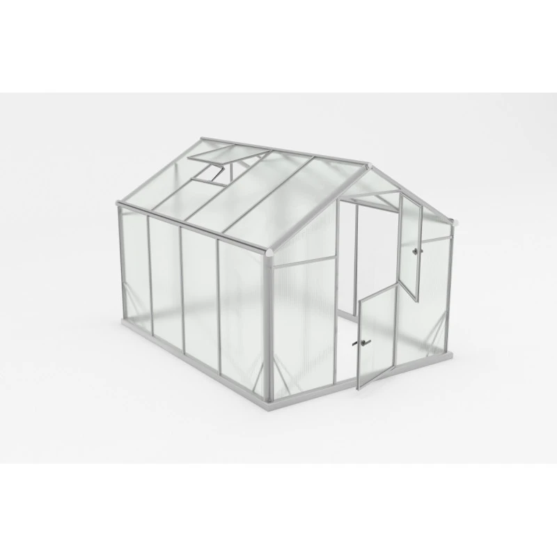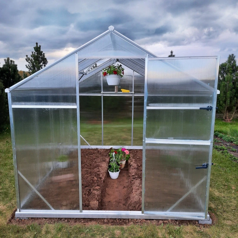 La serre jouit d’une excellente stabilité structurelle, avec des profilés en aluminium très résistants et des renforts d’angles métalliques. Une lucarne de ventilation à ouverture automatique assure une circulation optimale de l’air à l’intérieur de la serre, ainsi qu’une porte de type étable à deux panneaux dont l’ouverture se fait de façon indépendante. La porte est munie d’une poignée et de supports pour faciliter l’ouverture, un seuil bas permet le passage aisé d’une brouette ou de conteneurs à déchets organiques.