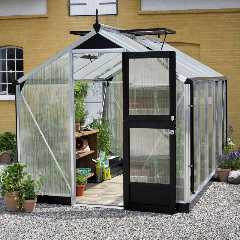La finition aluminium de cette serre lui confère un charme moderne et contemporain, avec les montants de la porte peints en noir. La porte est de type étable, en 2 parties ouvrables indépendamment l’une de l’autre. La partie inférieure peut être fermée, et la partie supérieure ouverte pour une aération naturelle à l’intérieur de la serre. Cette ventilation est contrôlée également par deux lucarnes à ouverture manuelle situées dans les éléments du toit.