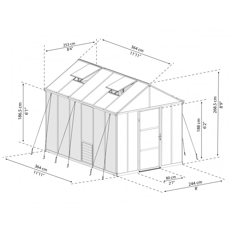 • Grande hauteur faîtière de 268cm et parois hautes de 191cm, idéales pour le palissage et les plantes volumineuses