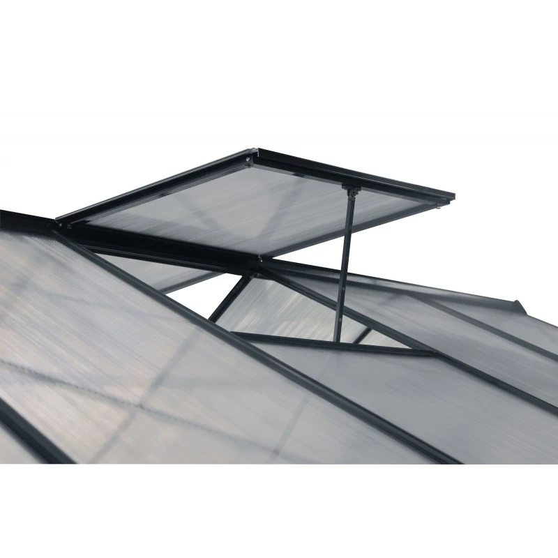 Les panneaux en polycarbonate de 4mm assurent quant à eux une bonne isolation thermique dans la serre. A la différence du verre, le polycarbonate limite les variations fatales de températures pouvant être nocives pour vos plantations. Grâce à une conception et un usinage de grandes qualités, vous n’aurez pas besoin de clips pour fixer les panneaux comme la plupart des serres basiques sur le marché. Les panneaux de polycarbonate viennent se glisser facilement dans l’armature ce qui simplifie le montage et accentue sa résistance.