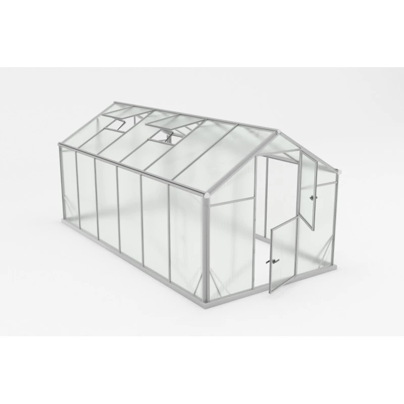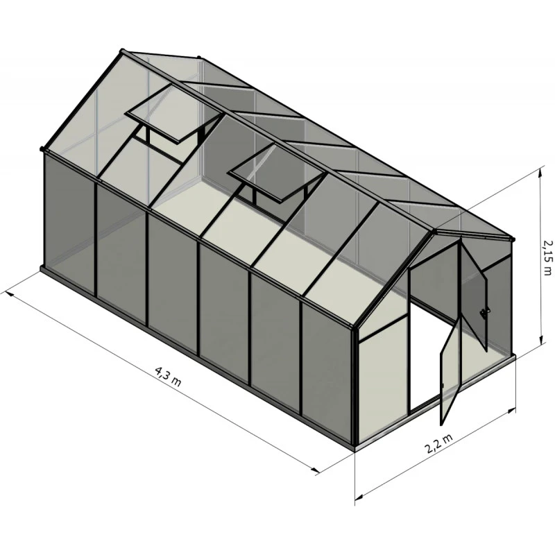 La serre jouit d’une excellente stabilité structurelle, avec des profilés en aluminium très résistants et des renforts d’angles métalliques. Deux lucarnes de ventilation à ouverture automatique assurent une circulation optimale de l’air à l’intérieur de la serre, ainsi qu’une porte de type étable à deux panneaux dont l’ouverture se fait de façon indépendante. La porte est munie d’une poignéeet de supports pour faciliter l’ouverture, un seuil bas permet le passage aisé d’une brouette ou de conteneurs à déchets organiques.