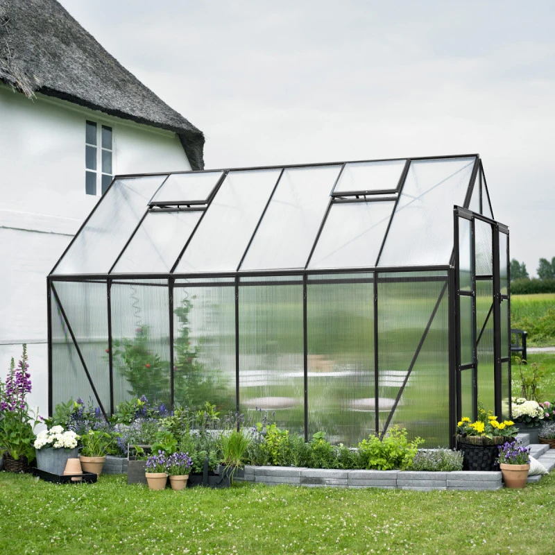 Ce modèle est conçu avec des profilés en aluminium laqué noir robustes sur lesquels viennent se clipser des panneaux de polycarbonate de 6mm, matériau idéal pour retenir la chaleur à l’intérieur de la serre. L’épaisseur de ce polycarbonate est supérieure de 50% par rapport au standard du marché.