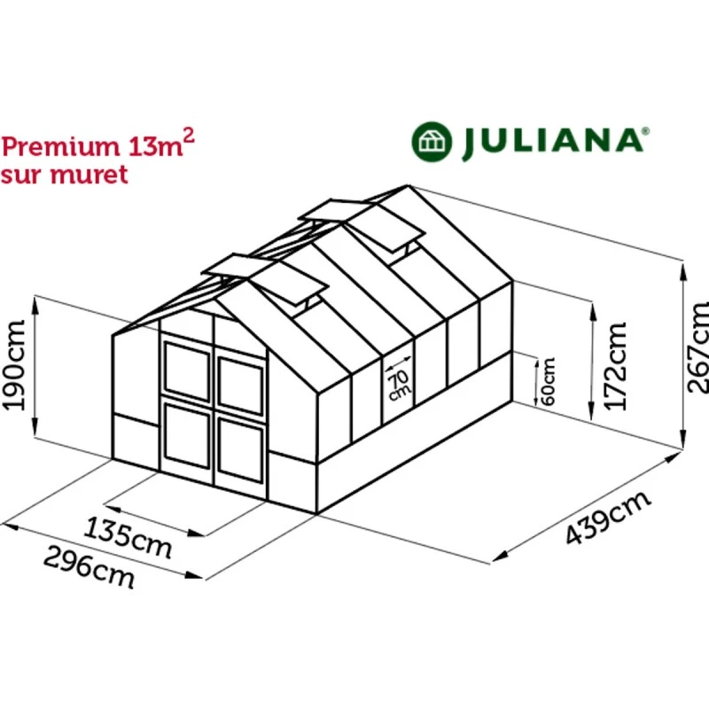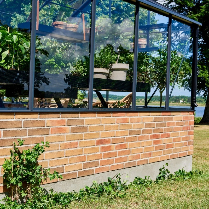 La serre Premium de Juliana à poser sur muret peut également être fournie avec un système de modules comprenant le périmètre de la fondation avec les pieds d’ancrage et des profilés servant de support aux panneaux de fibre-ciment gris pré-découpés et percés. Il vous suffit d’ajouter l’option dans votre panier, avec la serre. C’est un produit exclusif qui vous permettra de disposer d’une serre personnalisée, puisque les modules peuvent être parés d’une maçonnerie en briques, d’un crépi, d’un revêtement en lambris ou laissés tels quels.