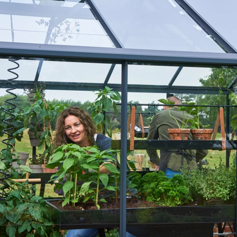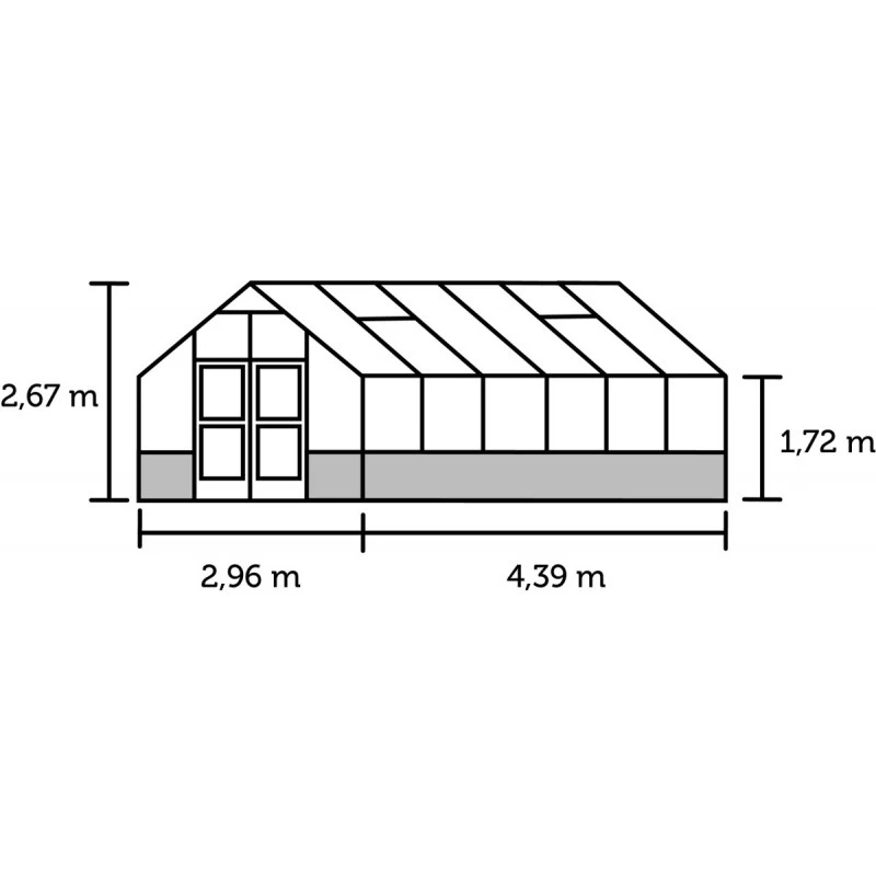 Avec ses dimensions de 439x296cm, cette serre développe une surface de 13m² pour une hauteur faîtière de 267cm sur des parois de 172cmm. Elle se prête très bien au palissage des plantes et vous pourrez vous y déplacer sans devoir vous abaisser. La structure est composée de profilés robustes en aluminium anthracite, d’un usinage précis pour une installation rapide et facile. Les fleurons sur la toiture, en plus de leur aspect esthétique, assurent la liaison de la barre faîtière, et des gouttières permettent la récolte d’eau de pluie.