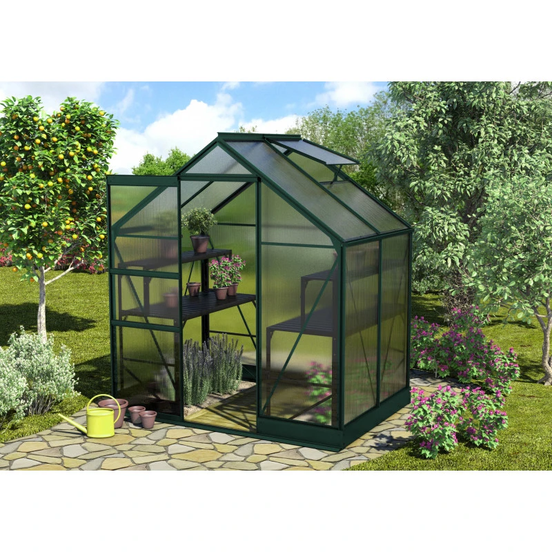 L’ossature de la serre de jardin Apollo 2500 est en aluminium léger et robuste pour un montage facile. Elle est revêtue d’une peinture en poudre de couleur émeraude ce qui renforce sa résistance à la corrosion et aux intempéries. C’est une finition de qualité à long terme qui lui confère, en outre, un aspect esthétique.