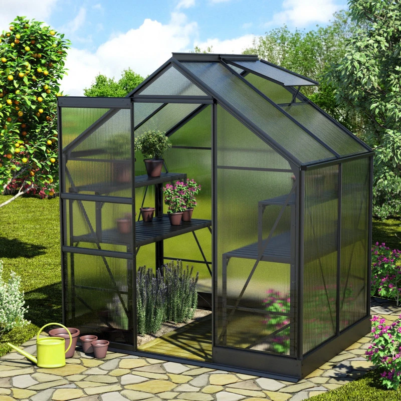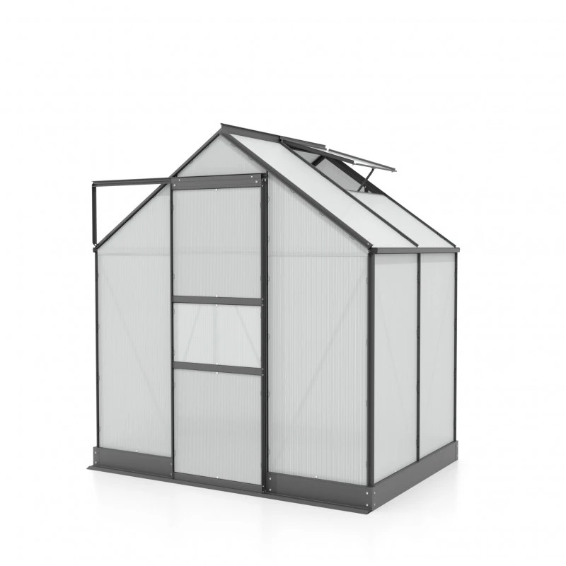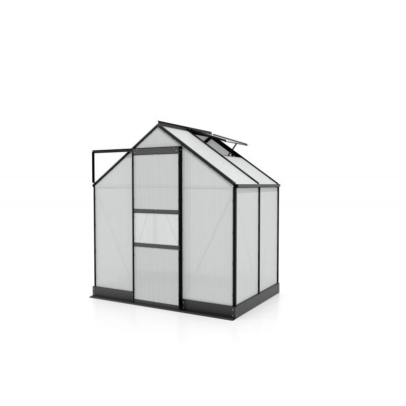 La serre de jardin Apollo 2500 en alu noir possède des panneaux en polycarbonate à double paroi de 6mm. Ils sont durables, résistants aux chocs et aux rayons UV, et d’excellentes propriétés isolantes. La lucarne incluse vous permet d’aérer votre serre tandis que les gouttières évacuent rapidement les eaux pluviales pour une meilleure étanchéité.