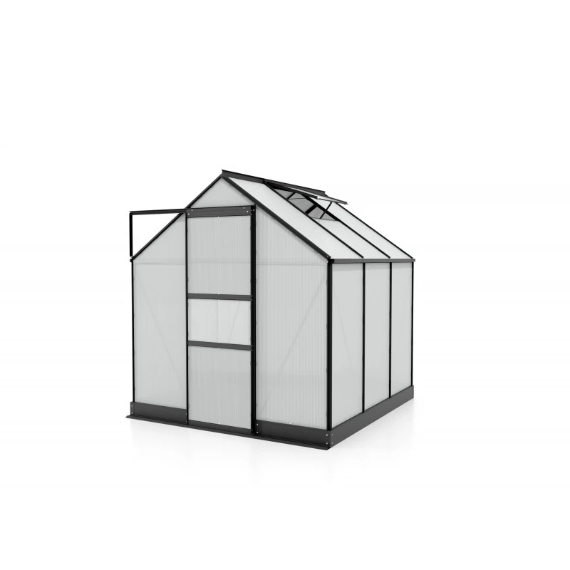 La serre de jardin Apollo 3800 possède une structure robuste en aluminium. Les profilés noirs ont subi un traitement par poudrage qui a renforcé leur résistance à la corrosion et aux intempéries. La couleur noire confère à la serre un aspect élégant.
