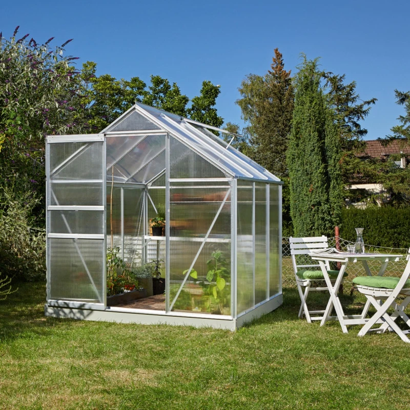 La serre de jardin Comet possède une structure durable en aluminium anodisé qui résiste parfaitement aux intempéries et à la corrosion. Son poids léger facilite le montage et vous permet de profiter de votre nouvelle serre en peu de temps. Il est cependant conseillé d’opter pour l’embase en acier galvanisé afin d’obtenir une meilleure stabilité au sol et une installation correcte à angle droit.