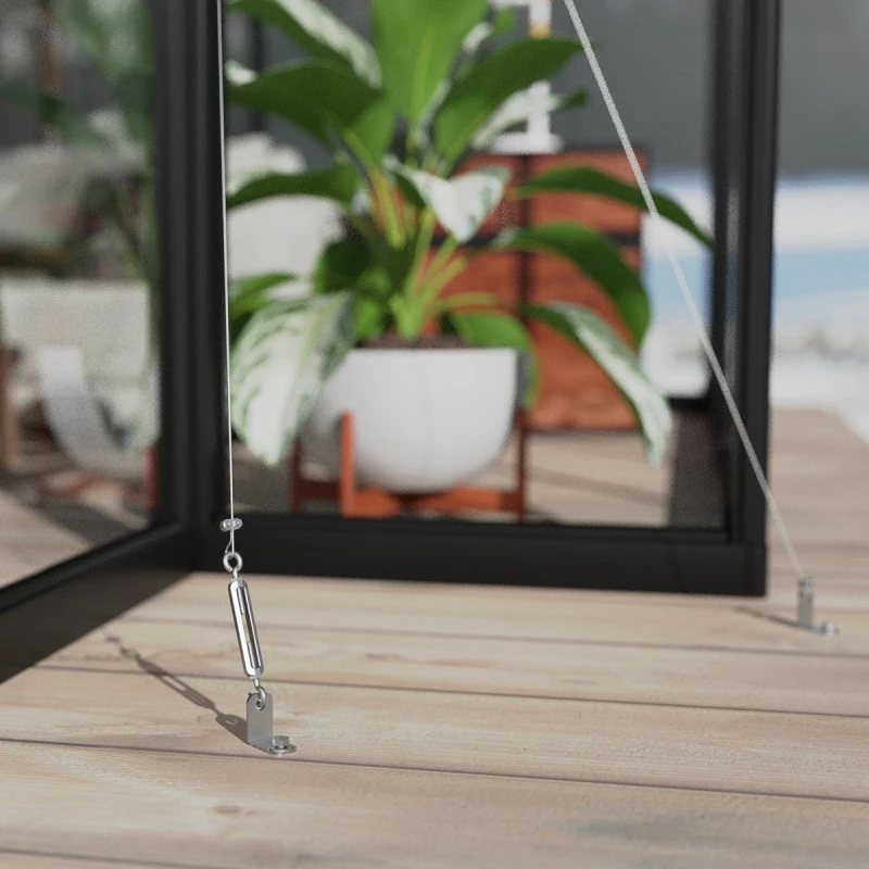 La serre de jardin Triomphe possède une structure robuste en aluminium renforcée par des supports internes et montée sur une base en acier galvanisé (kit d’ancrage non inclus). Solide et durable, elle supporte sans dommage les conditions extérieures variables et la rouille grâce à son revêtement en poudre. La couleur noire de la structure est en contraste parfait avec la transparence des panneaux de toit et des murs.