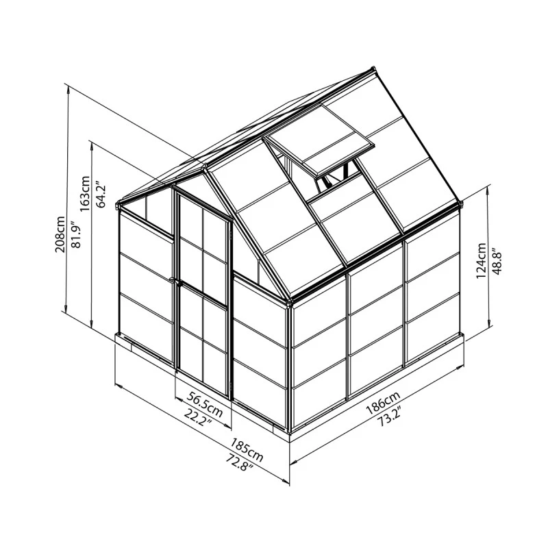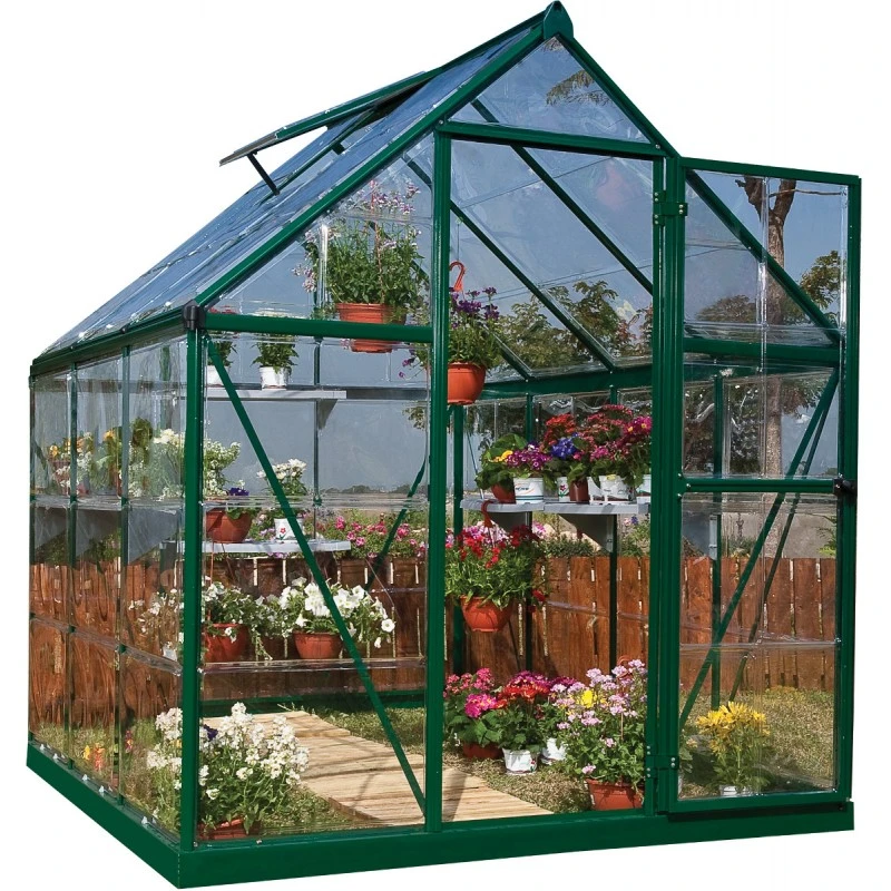 La serre Harmony™ verte 3,4m² de Canopia by Palram a une forme carrée de 185cm de côté. Le cadre en alu et l’embase fournie, en acier galvanisé, permettent une excellente rigidité structurelle, et sont recouverts d’une couche de peinture verte homogène résistante à la corrosion, qui se fondra harmonieusement dans le décor végétal de votre jardin.