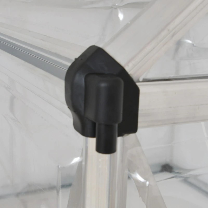La structure en aluminium argenté, assortie à l’embase en acier galvanisé, lui confère une grande stabilité, et les rainures dans les profils permettent une insertion facile des panneaux en polycarbonate qui composent les parois et la toiture.