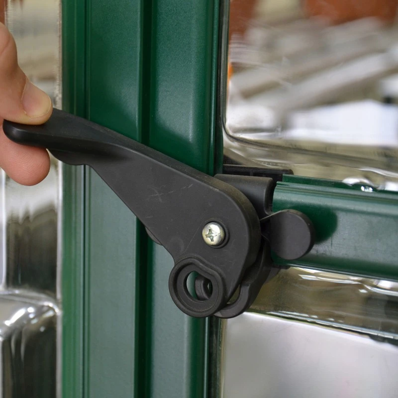 La porte peut être montée avec charnières à droite ou à gauche, et elle dispose d’un bloque porte magnétique très pratique. La lucarne vous permet une aération optimale, et la serre dispose de gouttières avec embouts pour descentes d’eau de pluie, qui vous permettront de récupérer cette eau pour l’arrosage de vos plantes.