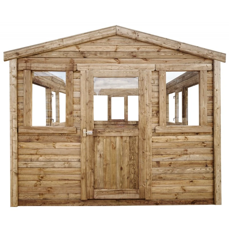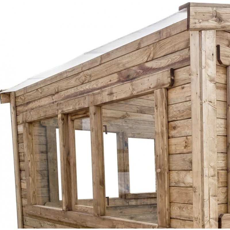 Détails techniques de la serre de jardin en bois 28mm traité marron 9m² – Gardy Shelter