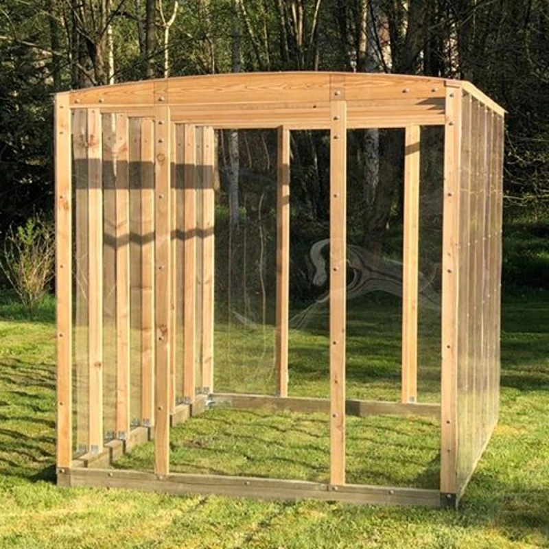 Matériaux : charpente en mélèze, embase en pin traité, vitrage en polycarbonate 2mm